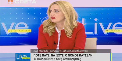 Η Άννα Κορσάνου μιλά στην εκπομπή Live με την Αντιγόνη του Creta TV για την Διάδοχη Κατάσταση του Νόμου Κατσέλη 17 Μαρτίου 2019 Δείτε το video